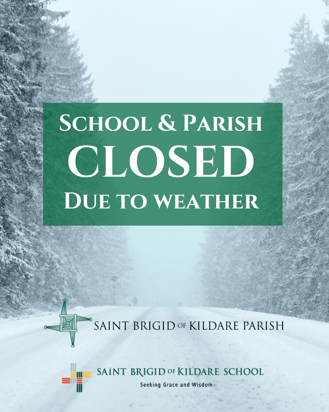 St. Brigid of Kildare Parish Office, School, Preschool, and Wolfhound Clubhouse will be closed on Monday, January 26, 2026 due to snow and road conditions. Stay safe!