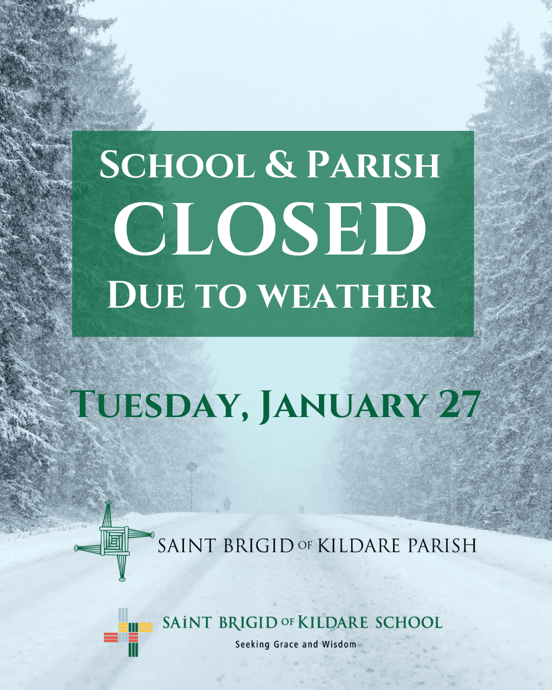 The Parish Office, St. Brigid School, Preschool, and Wolfhound Clubhouse will be closed tomorrow, January 27th due to the weather and road conditions.
